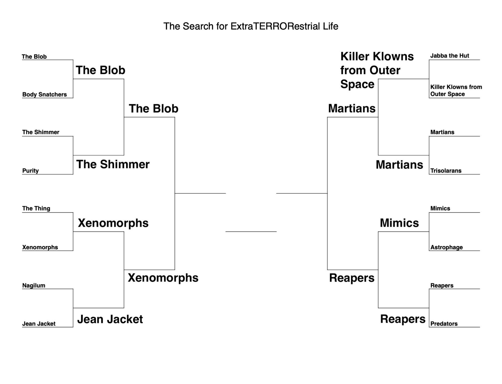 And while we’re on the topic of hair-raising extraterrestrial phenomena, welcome to week 3 of the Search for ExtraTERRORestrial Life, my October bracket to discover the Scariest Alien (recap here). Our second alien-on-alien tournament left four aliens dead in the dust, and four winners ready to face the next challenger.