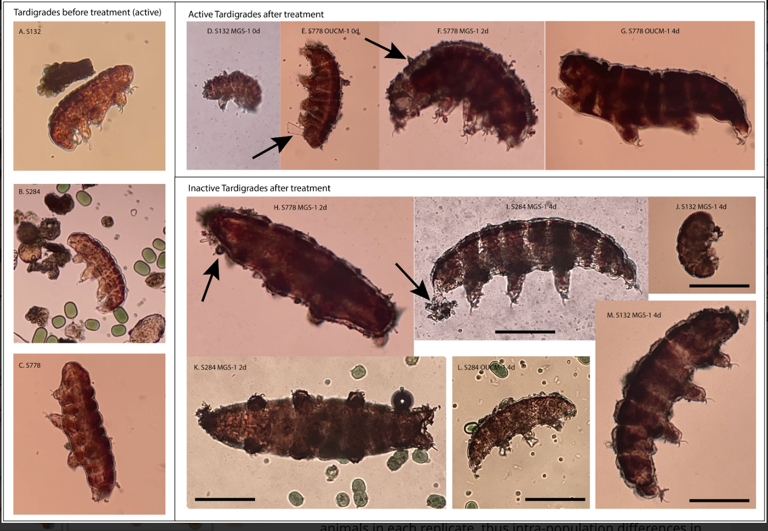 “In the control, active tardigrades remained energetic,” the team said. “In MGS-1, most remaining active tardigrades were barely moving after two days…Inactive tardigrades did not visibly move within 10–15 seconds and were often bloated or slightly curled (Fig. 2); some inactive tardigrades were visibly disrupted or degraded and presumed to be dead.”