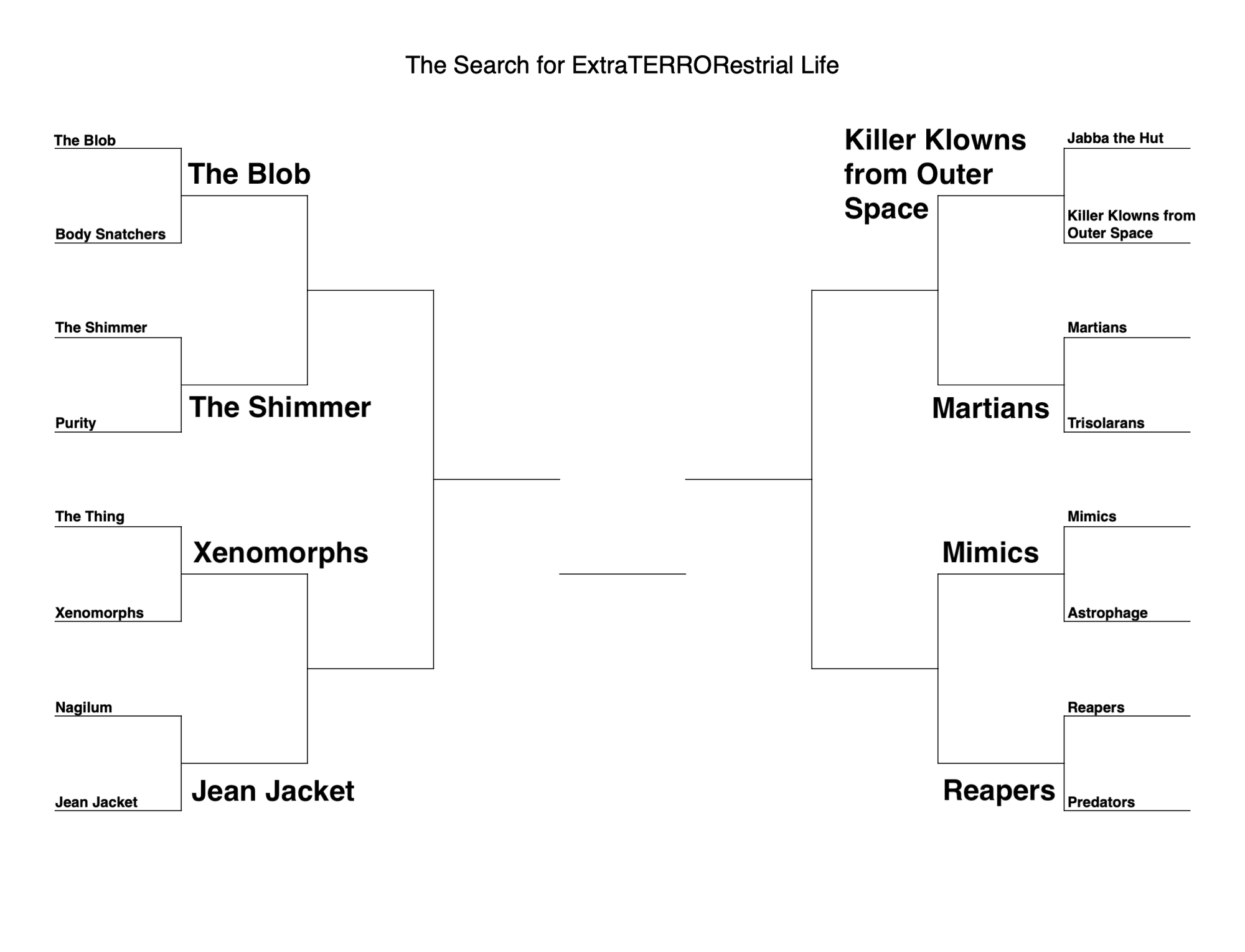 Here’s the updated bracket as we head into week 2: The Blob versus The Shimmer. Killer Klowns from Outer Space versus The War of the Worlds’ Martians. Xenomorphs versus Jean Jacket. Mimics versus Reapers. Email me at thebxfiles@gmail.com with your votes or thoughts on other candidates in the Search for ExtraTERRORestrial Life.