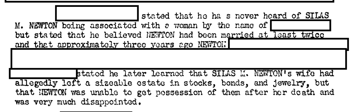 His FBI files reveals that more than a decade later, in the late 1960s, he was back to his old tricks. Newton had “salted” the Buckhorn Mine in Silver City, New Mexico, with valuable minerals to inflate the price of the site, leading to another fraud conviction. He was likely on probation for this scheme at the time of his death in 1972, according to this excellent resource from the Denver Public Library.