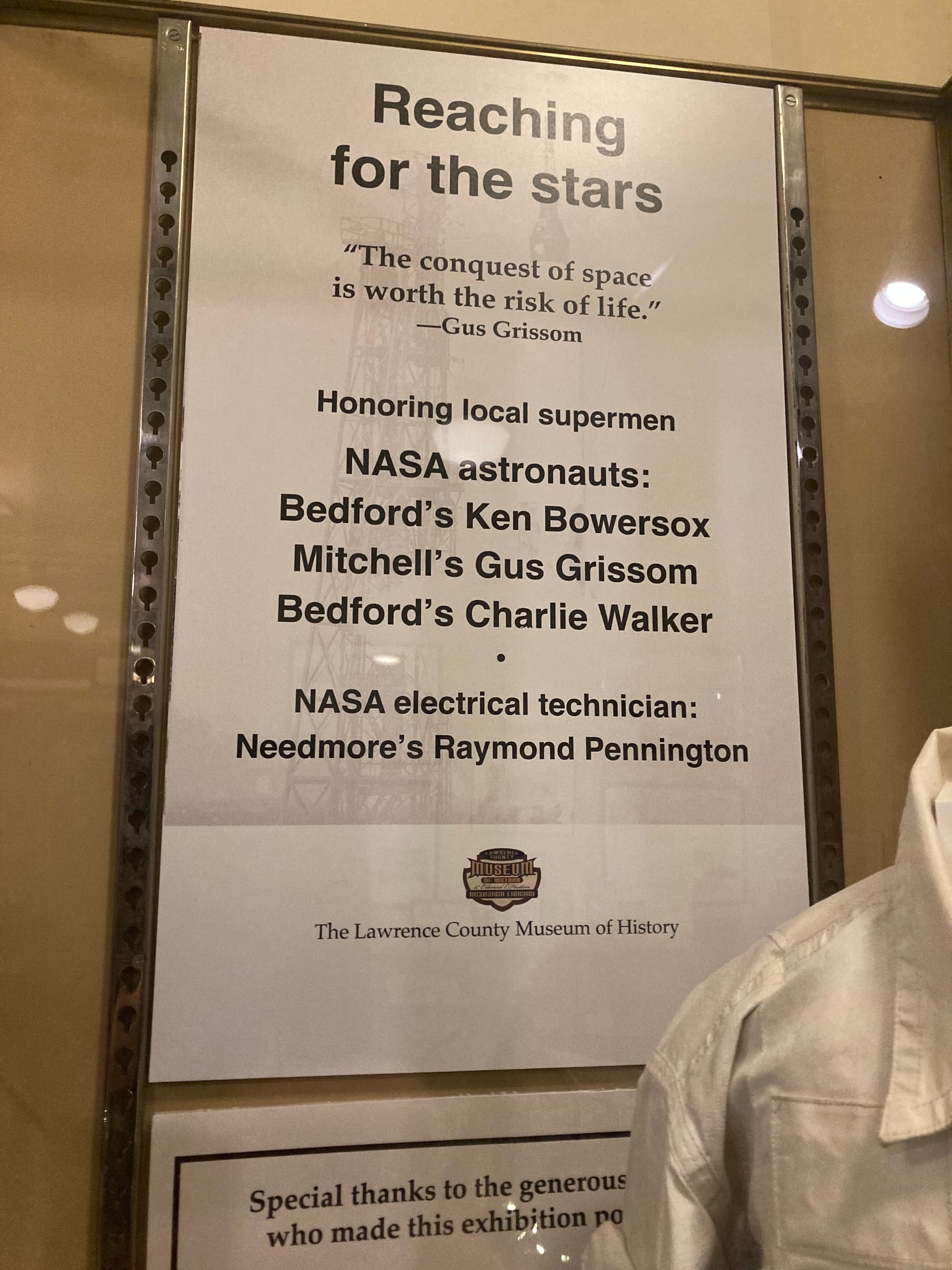 On the day of the Artemis II launch, I visited the Lawrence County Museum, which has devoted many exhibits to its homegrown spacemen. Fortunately, both Walker and Bowersox are alive and well, and have continued their service to space exploration since their retirements from NASA Astronaut Corps.